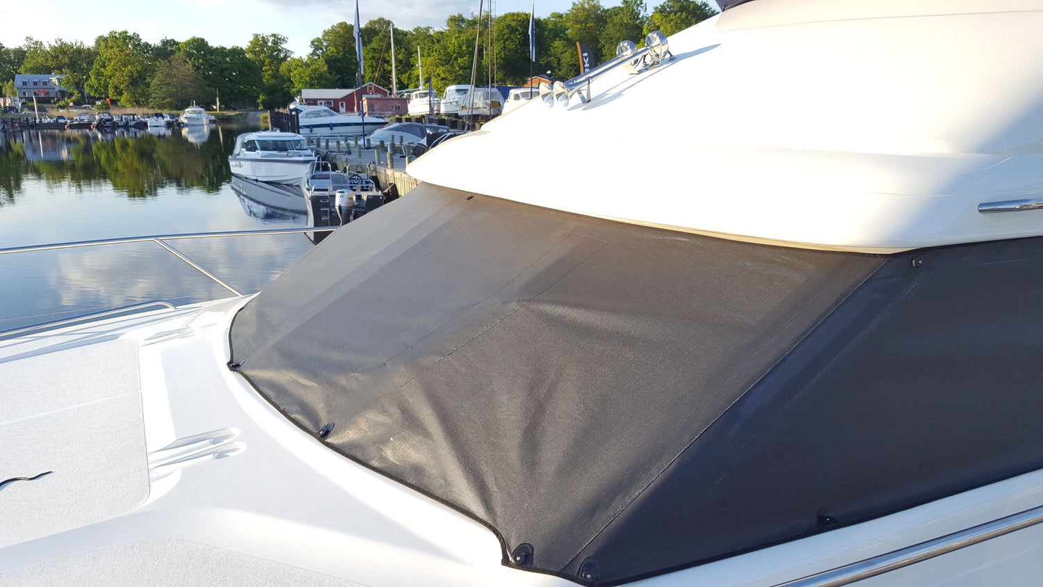 Få skugga på flybrigde på soliga och varma dagar. En bimini på flybridgen ger även skydd för mindre regn och ökar användandet av flybridgen. Bågarna förvaras monterade och nedvikta vid körning och till detta motorbåtskapell kommer en strumpa för att skydda båtkapellets tyg.